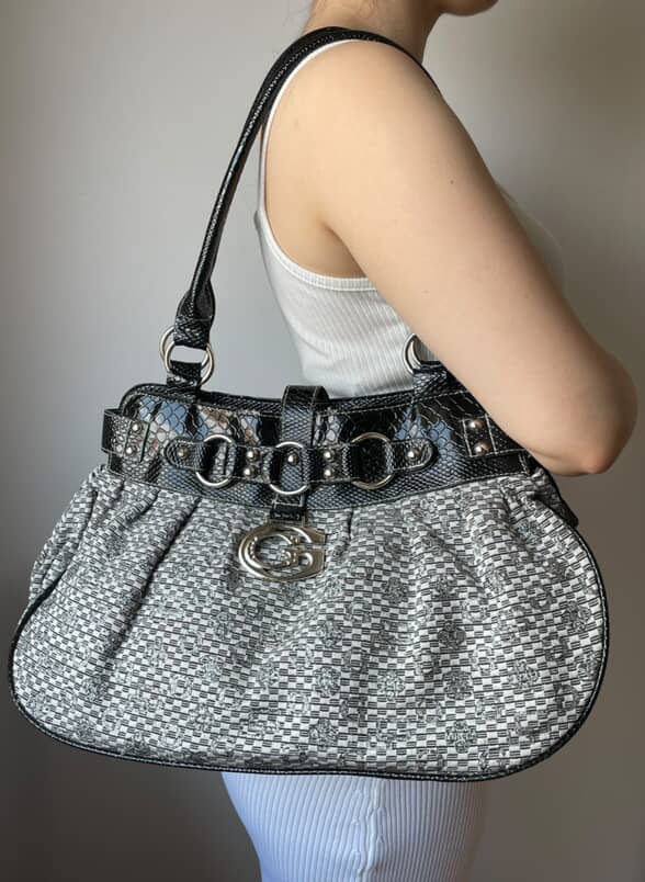Unikatna vintage Guess torba prepoznatljivog dizajna sa monogram printom i detaljima od crne eko kože sa zmijskim uzorkom. Masivna G kopča, metalni prstenovi i dvostruke drške daju joj edgy Y2K vibe. Prostrana i savršena za svaki dan.